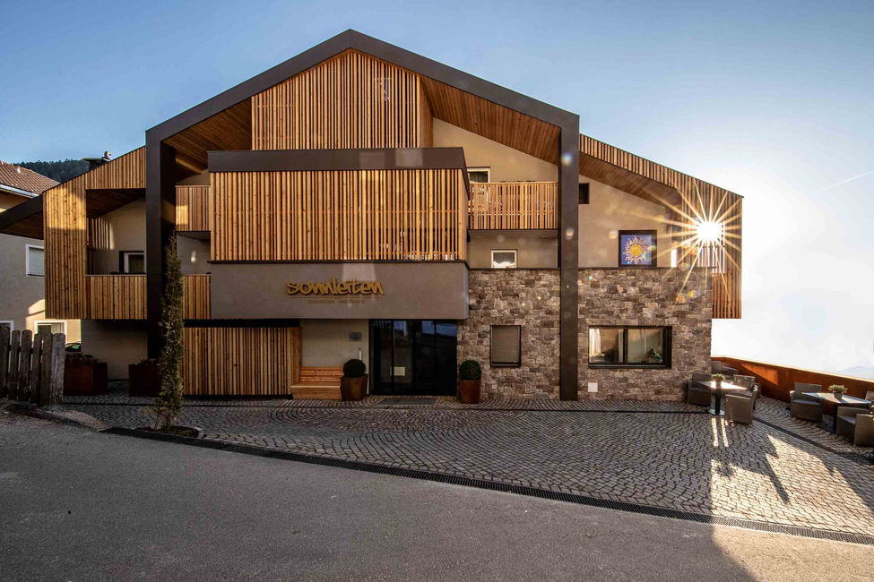 Sanierung und Erweiterung der Pension Sonnleiten, Umbau in Ferienwohnungen, Neugestaltung der Fassade und Umbau des Empfangs und Speisesaals.